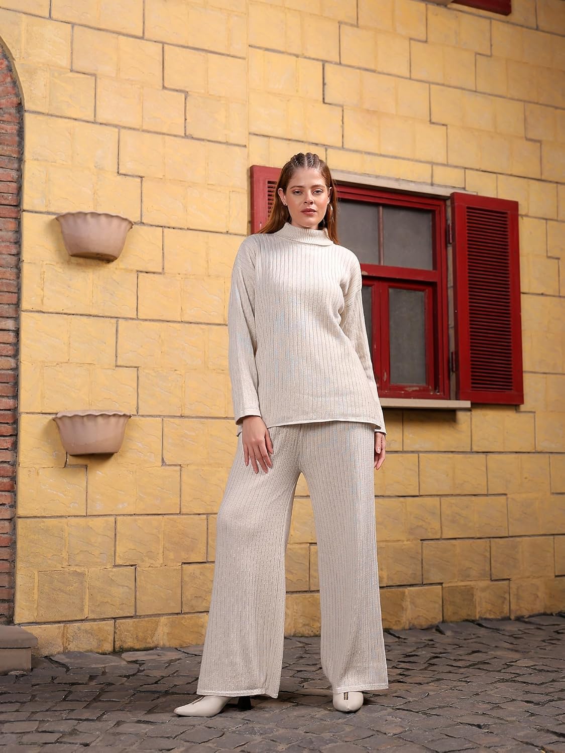 Kvetoo Women Winter Coord Set Wool Blend High Neck Sweater and Wide Leg Pants Warm Tracksuit Pajama Set Two Piece Knitwear Travel Wear for Lounge Casual Office